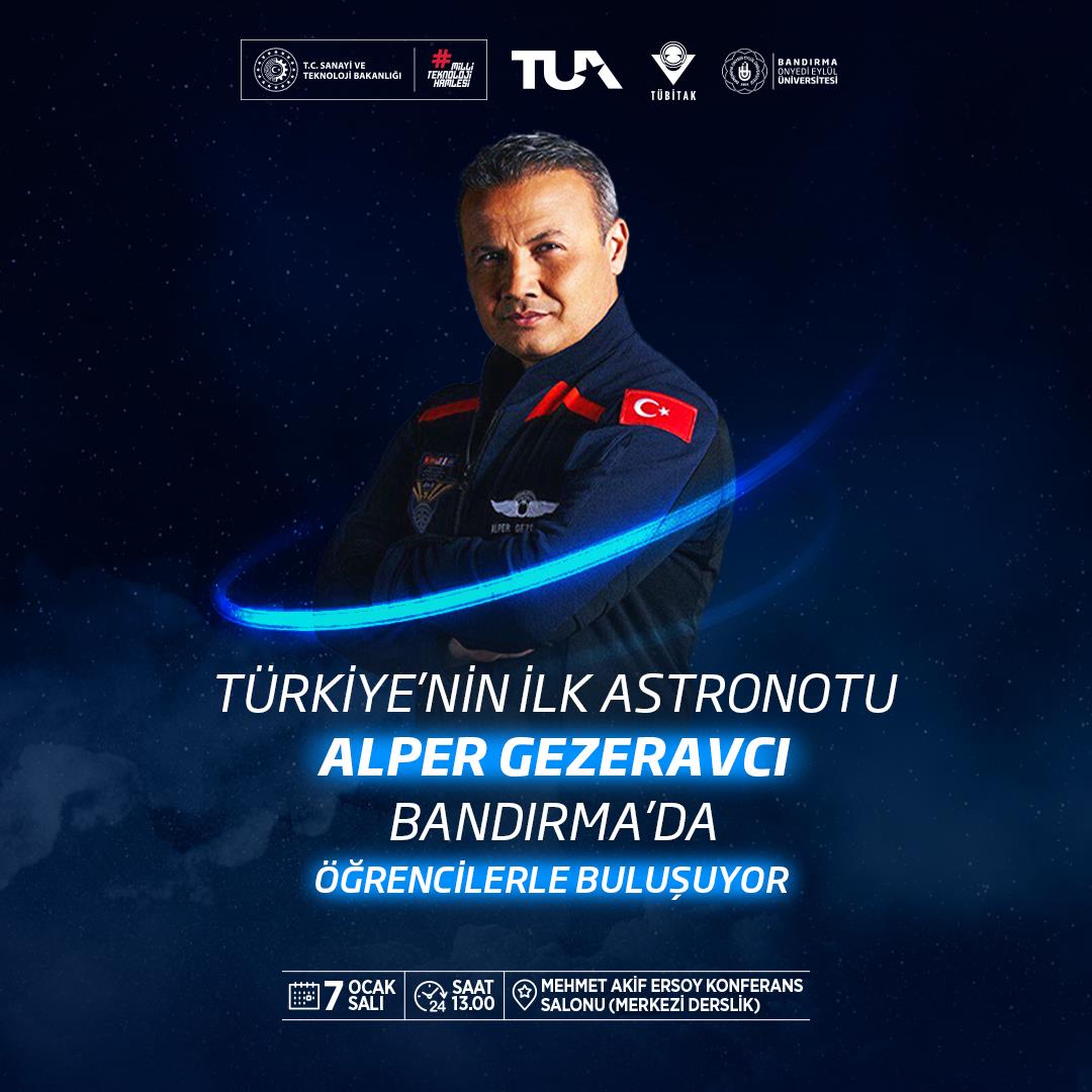 Türkiye’nin uzay çalışmalarındaki ilk astronotu Alper Gezeravcı, Bandırma Onyedi Eylül Üniversitesi öğrencileriyle buluşuyor. Uzay araştırmalarında Türkiye’yi başarıyla temsil eden Alper Gezeravcı, öğrencilere ilham vermek ve tecrübelerini paylaşmak üzere BANÜ’de bir konferans gerçekleştirecek. Uzay araştırmalarının önemi, gelecekteki projeler ve astronotluk sürecine dair konuların ele alınacağı konferans, 7 Ocak 2025 Salı günü saat 13.00’te Mehmet Akif Ersoy Konferans Salonu’nda düzenlenecek.
