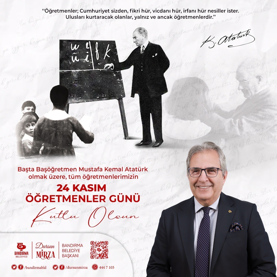 Bandırma Belediye Başkanı Dursun Mirza 24 Kasım Öğretmenler Günü dolayısıyla mesaj yayınladı. Mirza mesajında ” Atatürk ilke ve devrimlerine yürekten bağlı, bağımsız, demokratik ve lâik bir toplum yaratma ülküsüne yürekten inanmış bütün Cumhuriyet öğretmenlerimizin 24 Kasım Öğretmenler Günü Kutlu Olsun…