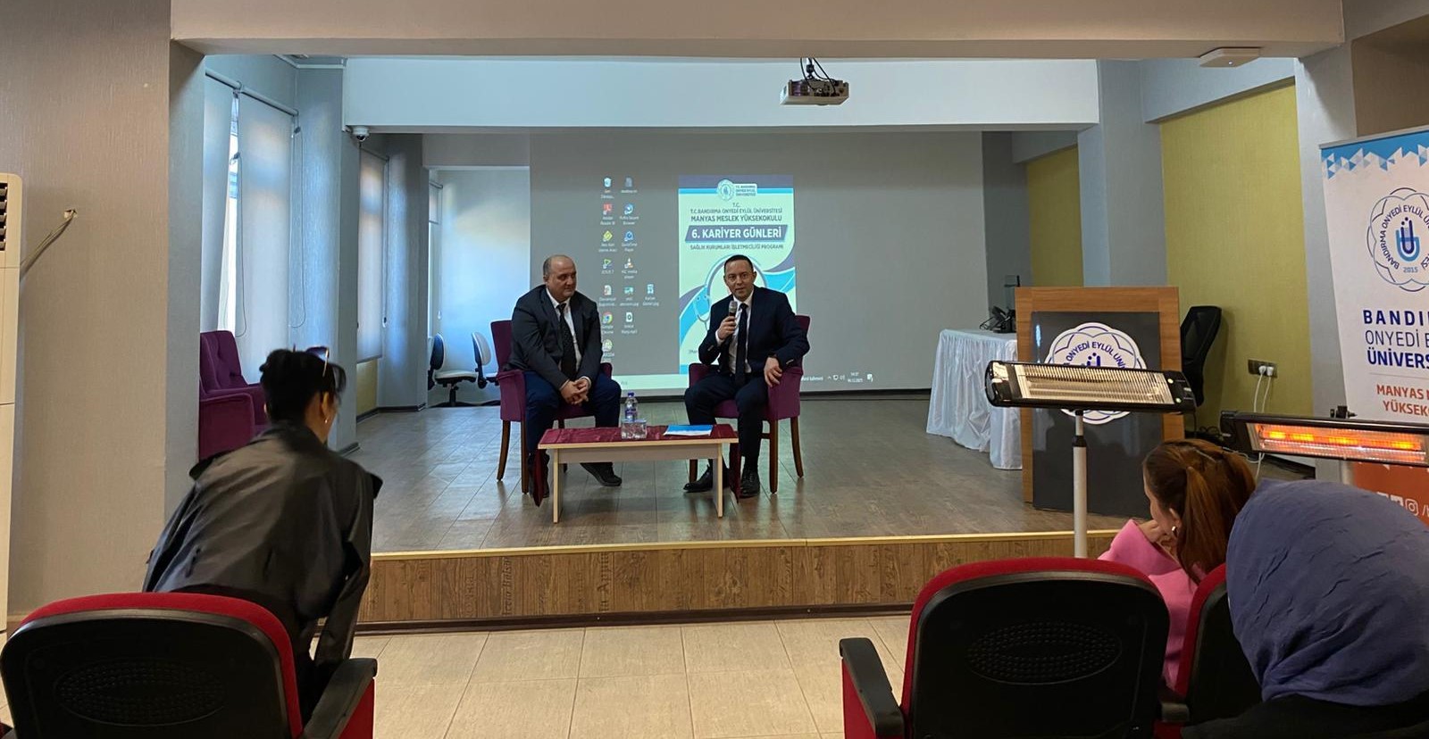 Kariyer Günleri kapsamında gerçekleştirilen bir diğer etkinlikte ise Manyas Devlet Hastanesi İdari ve Mali Hizmetler Müdürü Kerim Şen, öğrencilerle bir araya geldi. Etkinlik, Yönetim ve Organizasyon Bölümü Öğretim Görevlisi ve Manyas Meslek Yüksekokulu Müdür Yardımcısı Öğr. Gör. Coşkun Kalp’in moderatörlüğünde gerçekleştirildi. Programda; kamuda kariyer olanakları, kamu kurumlarında staj imkânları, 3+1 Eğitim Modeli kapsamında yürütülen staj süreçleri, mezunların kamuda istihdam edilebileceği alanlar ile kamu kurumlarının işleyişi, mesleki beklentiler ve kariyer planlamasına ilişkin kapsamlı bilgiler paylaşıldı.