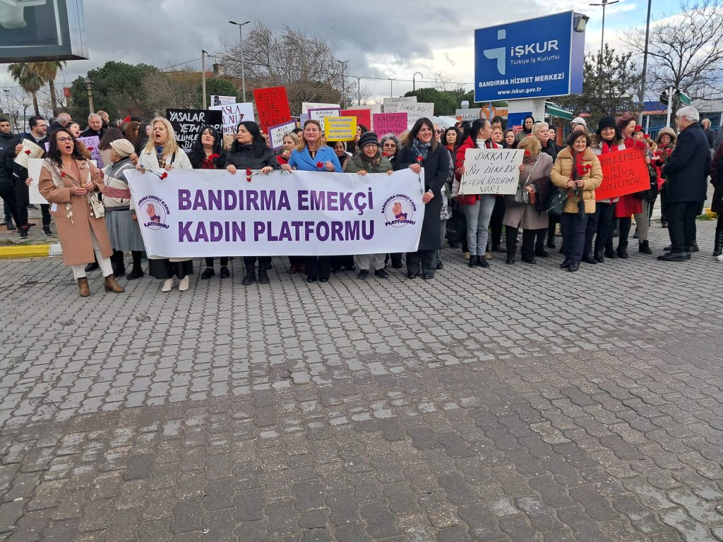 İDO iskelesi önünden başlayarak Cumhuriyet Meydanına kadar pankartlar ve sloganlarla yürüyen kadınlar daha sonra meydanda açıklamada bulundu. Bandırma Emekçi Kadın Platformu tarafından yapılan açıklamada ” 166 Yıl öncesinden bugüne emek, hak ve eşitlik mücadelesi uğruna hayatını kaybeden işçi kadınların mücadelesini selamlıyoruz. Onların sesine sesimizi katarak ayırımcılığa, şiddete, eşitsizliğe, sömürüye, gericiliğe, baskılara, ve savaşlara karşı sesimizi yükseltiyoruz. 8 Mart, kadın sorunlarının özünde toplumsal cinsiyet ayırımcılığı olduğunun, kadınlara karşı yapılan her türlü ayırımcılığın ortadan kaldırılması, kadına yönelik şiddete son verilmesi gerektiğinin dillendirildiği gün olmaya devam etmektedir. Kadınların yaşadığı sorunların temelinde önemli bir insan hakları konusu olan toplumsal cinsiyet uygulamaları yatmaktadır. Toplumsal cinsiyet ayırımcılığının dayattığı yaşam biçimine uygun davranarak, ailesinin ve toplumun yararı adına, değersizleştirilen emeği ve hakkı için çatışmaktan, görünür olmaktan vazgeçen kadınlarda oluşan duygusal çöküntü, çok ciddi ölümcül sağlık sorunlarına yol açmaktadır. Kadınlar kendi yaşamına değer vermeli, yaşamın her alanına erkeklerle eşit katılmalıdır” denildi.