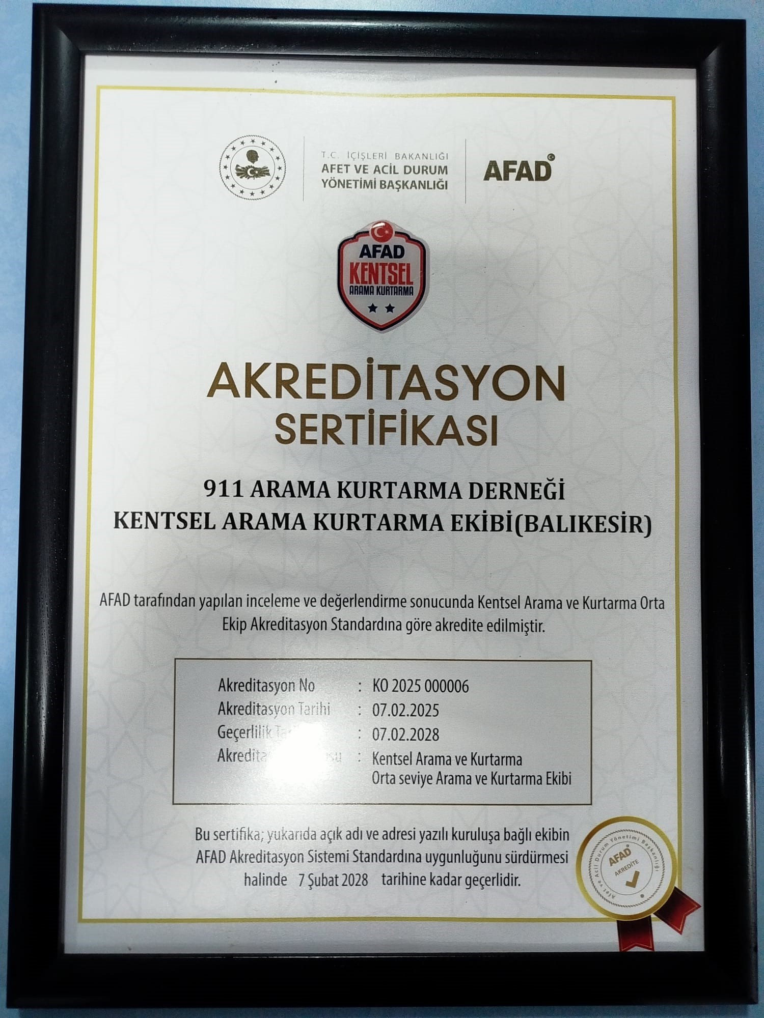 28 Yıldır Bandırma merkezli faaliyet gösteren ve sivil toplumun afet müdahale kapasitesini temsil eden Derneklerden biri olan 911 Arama Kurtarma Derneği, T.C. İçişleri Bakanlığı Afet ve Acil Durum Yönetimi Başkanlığı (AFAD) tarafından verilen Orta Seviye Kentsel Arama ve Kurtarma Akreditasyonunu başarıyla tamamlayarak Türkiye’nin afetlere hazırlık ve müdahale gücüne önemli bir değer kattı. AFAD standartlarında akredite edilen 911 Arama Kurtarma, ulusal afet yönetim sistemindeki yerini sağlamlaştırarak, kriz anlarında profesyonel, koordineli ve yüksek standartta bir müdahale yetkinliğine sahip olduğunu resmen tescillendi.