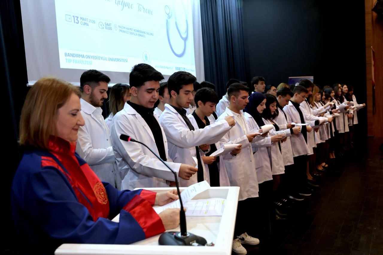 Açılış konuşmalarının ardından Tıp Fakültesinin tanıtım videosu katılımcılara izletildi. Programın devamında gerçekleştirilen Beyaz Önlük Giyme Töreni kapsamında, Tıp Fakültesi 1. sınıf öğrencilerine beyaz önlükleri Rektör Prof. Dr. İsmail Boz, Prof. Dr. Alpaslan Serel, Prof. Dr. Ebru Kaya Mutlu, Prof. Dr. Mehmet Emin Erçakar, Tıp Fakültesi Dekanı Prof. Dr. Ayşe Güldem Kilciler, Bandırma Eğitim ve Araştırma Hastanesi Başhekimi Dr. Öğr. Üyesi Nart Görgü başta olmak üzere öğretim üyeleri tarafından giydirildi.