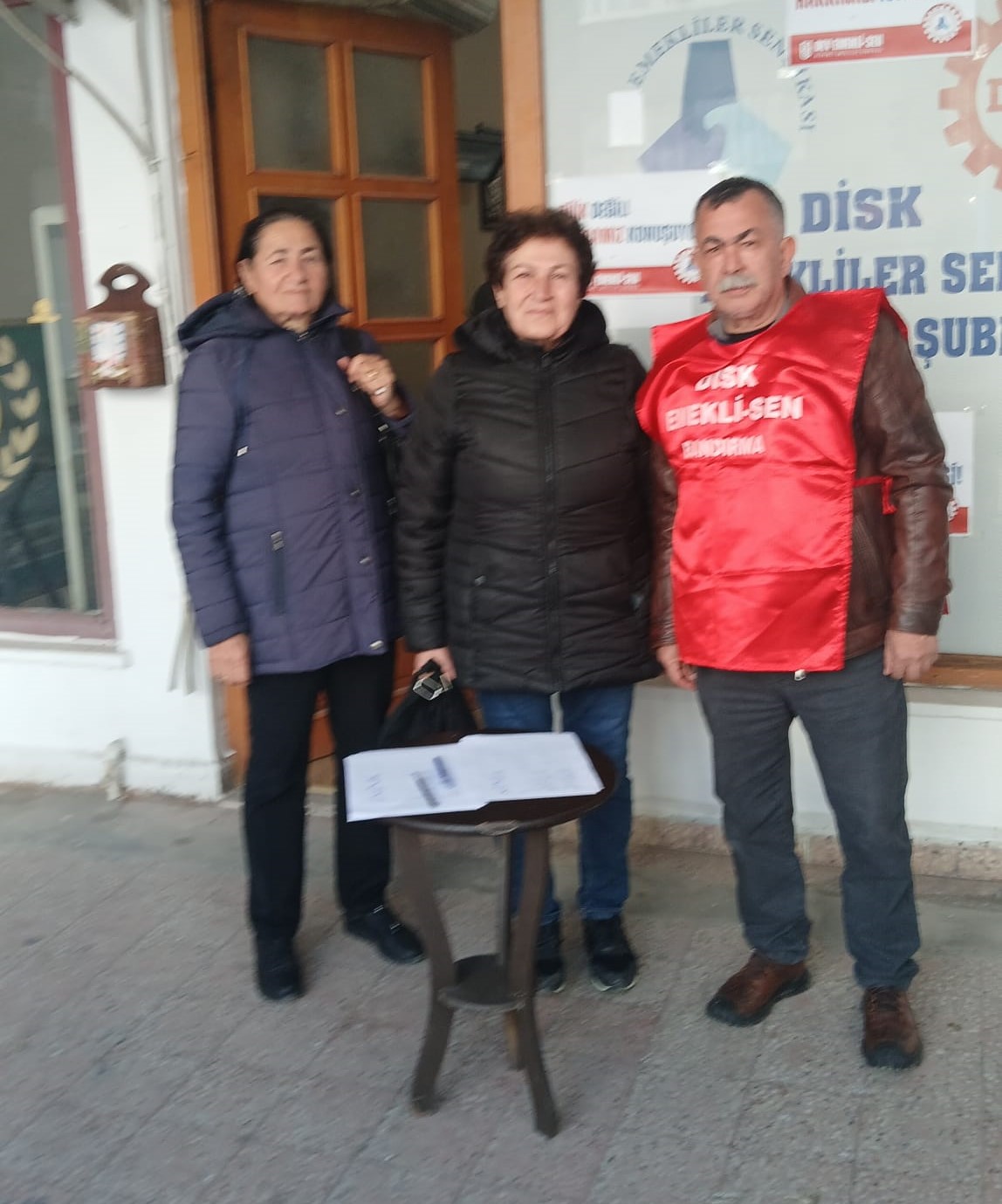 Bandırma DİSK Devrimci Emekliler Sendikası Şubesi 3-6 Mart 2026 (5gun ) sürecek olan emeklilerin bayram ikramiyelerinin asgari ücret seviyesine çekilmesi ve emeklilerin sendikal örgütlenmesinin önündeki engellerin kaldırılması için TBMM’ye verilmek üzere imza kampanyasını sendika şubesi önünde başlattı.