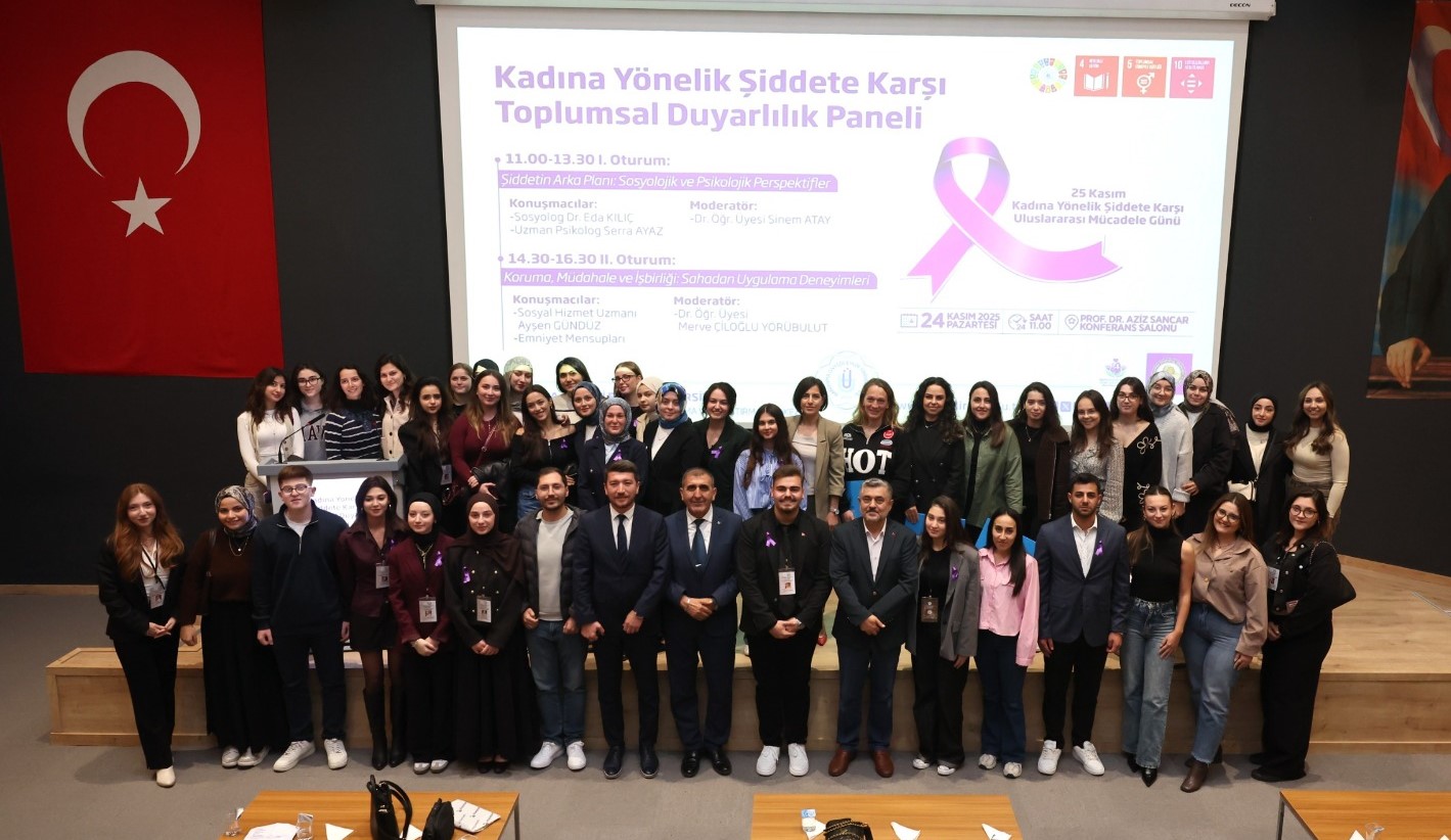 BANÜ Kadın, Aile ve Toplum Hizmetleri Uygulama ve Araştırma Merkezi (BANÜ-KAT) ile Sosyal Hizmet Topluluğu tarafından, 25 Kasım Kadına Yönelik Şiddete Karşı Uluslararası Mücadele Günü kapsamında bir panel gerçekleştirildi. Prof. Dr. Aziz Sancar Konferans Salonu’nda gerçekleştirilen panel, saygı duruşu ve İstiklal Marşı’nın okunmasıyla başladı. Programa; Rektör Prof. Dr. İsmail Boz’un eşi Sibel Boz, İktisadi ve İdari Bilimler Fakültesi Dekanı Prof. Dr. Serap Palaz Çakır, öğretim üyelerimiz, kadın dernekleri temsilcileri, basın mensupları ile öğrenciler katılım sağladı.